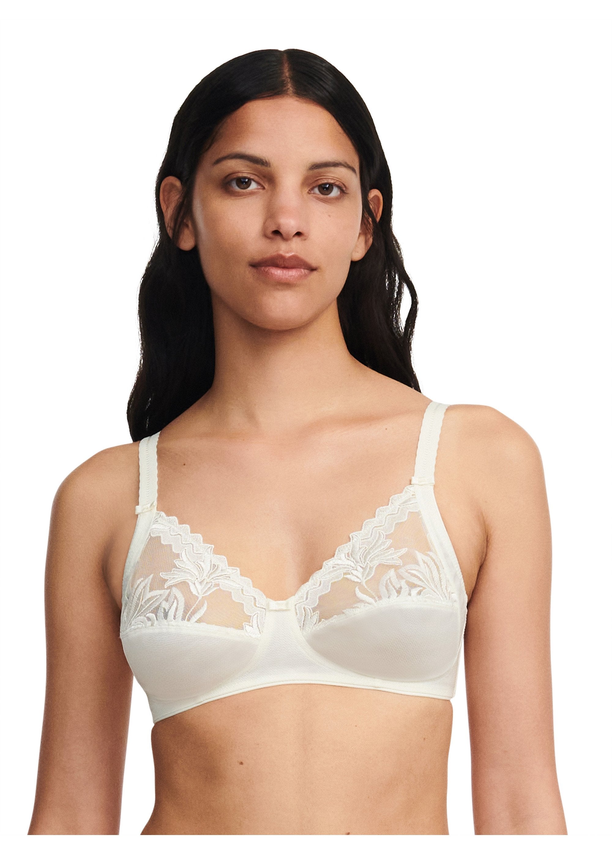 Chantelle's Amazone Non-wired bra. A flattering cut in fancy polyamide knit. Embroidered tulle hat top (70% polyester, 26% polyamide, 4% viscose). Cutouts and soft ribs on the sides. Adjustable stretch scalloped straps. Double back stapling 3 positions. Back: 80% polyamide, 20% elastane. This product is excluded from any reduction. This product is certified OEKO-TEX® STANDARD 100 by OEKO-TEX® (N° CQ1105/2 IFTH)