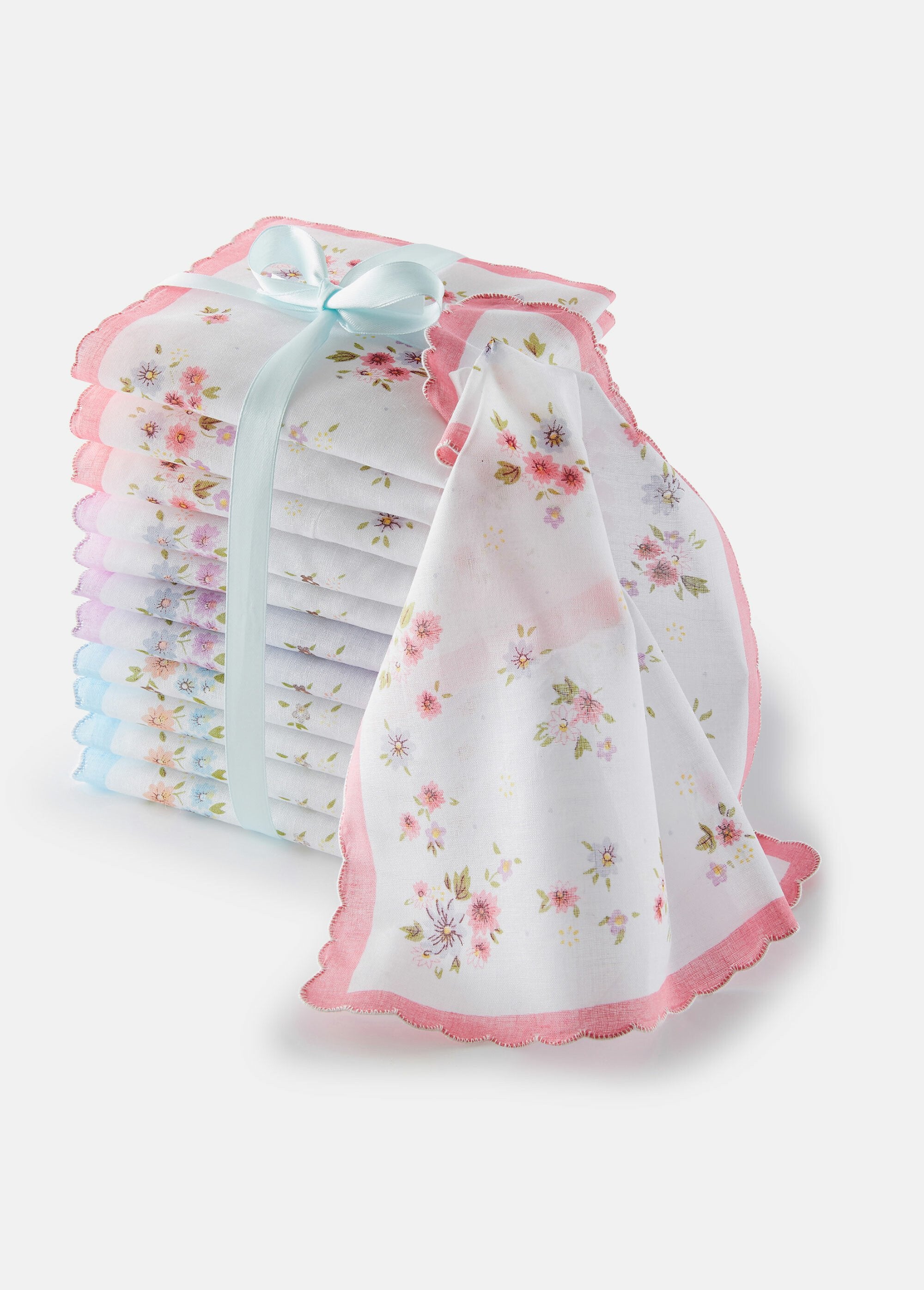 Elegant women's handkerchiefs made from high-quality cotton. Refined simplicity is enhanced with a discreet scalloped band and a printed floral design. Available in assorted colors.