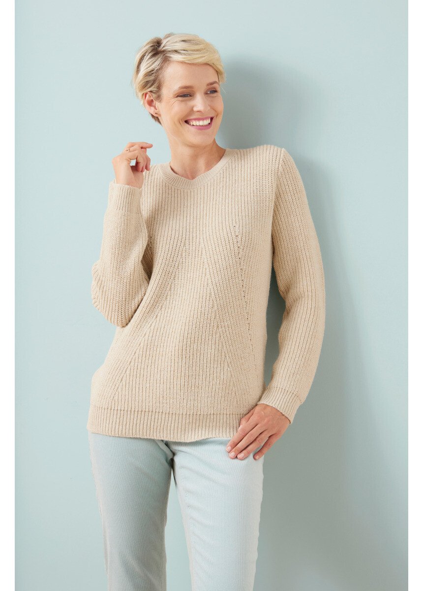 The pearl knit sweater combines quality, fantasy and femininity. Play of pearl knit and openwork fancies on the front. Ribbed finishes at the round neckline, at the base and at the bottom of the long sleeves.
